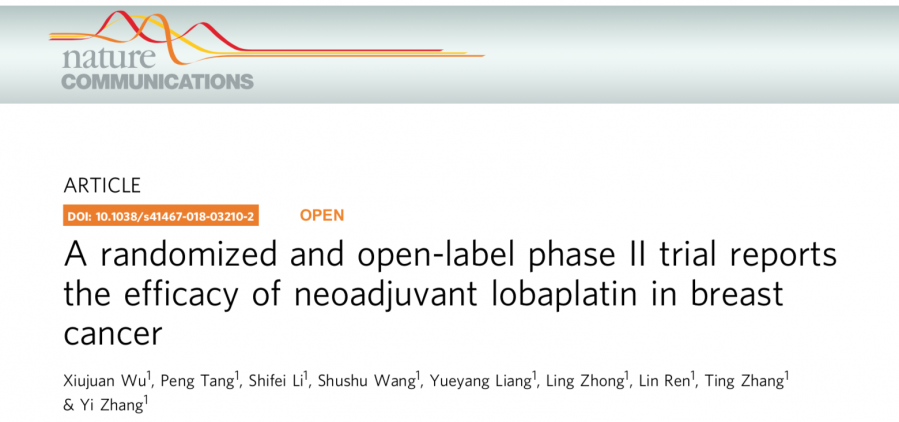 Wu Xiujuan,Tang Peng,Li Shifei,et al. A randomized and open-label phase II trial reports the efficacy of neoadjuvant lobaplatin in breast cancer.[J]. Nature communications,2018,9(1).