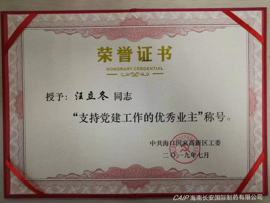 為表彰先進(jìn),弘揚(yáng)正氣,中共??趪?guó)家高新區(qū)工委分別授予海南長(zhǎng)安國(guó)際制藥有限公司黨支部書記汪立冬和黨支部委員陳麗娟“支持黨建工作的優(yōu)秀業(yè)主”和“優(yōu)秀黨務(wù)工作者”稱號(hào)。