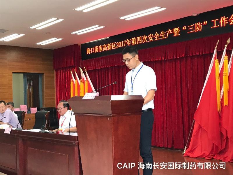 2017年10月20日,在??趪腋咝聟^(qū)2017年第四次安全生產(chǎn)暨“三防”工作會議上,海南長安國際制藥有限公司等11家企業(yè)在第20號臺風(fēng)卡努期間,積極配合高新區(qū)管委會做好防風(fēng)防汛及臨時避險點的安置工作,獲得優(yōu)秀企業(yè)表彰,公司有幸代表受表彰的企業(yè)之一受邀上臺發(fā)言。